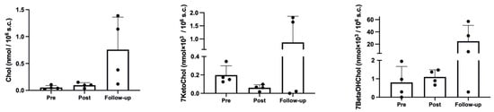 As shown in Figure 2, the hypoxic trek led to a significant increase in cholesterol (p = 0.048, η2p = 0.54, ω2p = 0.41), with a clear, although non-significant in post hoc comparisons, increase at Follow-up, compared with both Pre (p = 0.083) and Post (p = 0.105). The effect on 7-ketocholesterol was not significant (p = 0.168, η2p = 0.33, ω2p = 0.17), although it showed a decrease at Post and an increase over baseline values at Follow-up. A similar result to cholesterol was obtained for 7-beta hydroxycholesterol (p = 0.108, η2p = 0.43, ω2p = 0.28), with almost similar values indicating a slight increase at Post, compared with Pre, and a further increase at Follow-up.