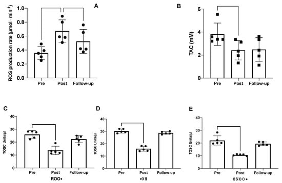 EPR results of (A) ROS production rate and (B) TAC via EPR detection. ORAC results of (C) anti-peroxyl (ROO•), (D) anti-hydroxyl (•HO), and (E) anti-peroxynitrite (ONOO•) antioxidant activity of human seminal fluid. Significantly different data are displayed between brackets. Changes over time were significant at * p < 0.05; ** p < 0.01.
