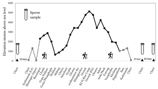 Male fertility is essentially based on the constant production of spermatozoa, generated from spermatogonial stem cells (SSCs) through their self-renewal and by the processes of mitosis, meiosis, and spermiogenesis, leading to mature sperm [] with a production cycle of approximately 70 days []. This was the reason for determining the follow-up period as after 70 days, which can explain the further fall in sperm count. Such reduced sperm count at Follow-up, along with the increase in cholesterol and oxysterols, can be interpreted mainly as the effect of the redox system disruption that occurred during the expedition, due to hypoxic stress on the testis parenchyma and more precisely at the germinative epithelium of the seminiferous tubules. This stress was present during the first and proliferative phase of spermatogenesis which lasts 16 days. Precisely, during these 16 days of the “mitotic phase”, spermatogonial stem cells generate cells that undergo amplifying divisions and change into differentiating spermatogonia []. In other terms, the entire period of hypoxic trekking (see Figure 5) coincided with the entire first proliferative phase of spermatogenesis. Therefore, it is reasonable to argue that the negative effects on the seminal profile showed the greater involvement of the mitotic processes of spermatogenesis rather than those related to the meiotic and/or spermiogenesis phases.