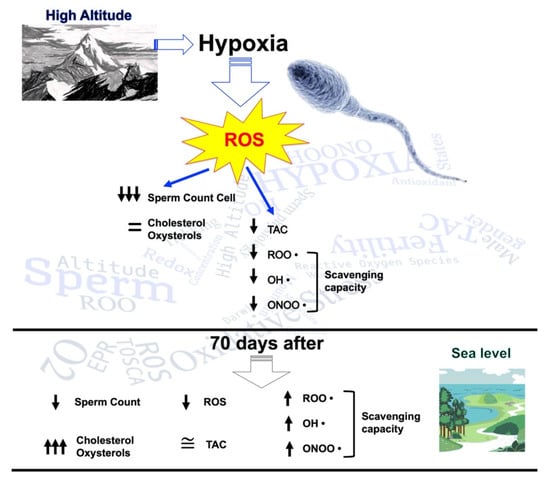 Scheme of the influence of high altitude on sperm count cells, cholesterol, oxysterols, reactive oxygen species (ROS) production, and antioxidant capacity. Evaluation was performed with seminal fluid collection.