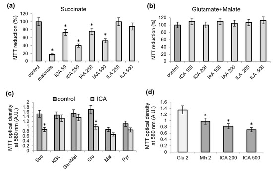 Influence of indolic acids on the oxidation of mitochondrial substrates, as measured by the MTT assay. MTT reduction (%) after a 5-min incubation of mitochondria with indolcarboxylic acid (ICA, 50 and 250 µM), indolacetic acid (IAA, 250 and 500 µM) and indollactic acid (ILA, 250 and 500 µM), and succinate (a) or glutamate plus malate (b) as substrates of oxidation; influence of ICA (200 µM) on MTT reduction after a 5-min incubation with mitochondria during the oxidation of succinate and NAD-dependent substrates (c); effects of malonate (2 mM) and ICA (200 and 500 µM) on MTT reduction activated by glutamate (d). Substrates were added at a concentration of 2 mM. Asterisks (*) indicate values that differ significantly from the control values (p < 0.05).