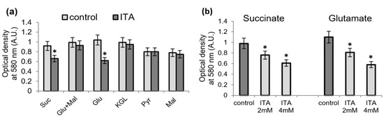 We compared the influence of ICA on the oxidation of mitochondrial substrates with the impact of ITA. ITA is known to inhibit succinate oxidation and does not influence the oxidation of glutamate plus malate, or pyruvate plus malate [7]. As shown in Figure 2, ITA inhibited the oxidation of succinate and did not affect the oxidation of glutamate plus malate as measured by the MTT assay. However, like ICA, it also inhibited glutamate oxidation. The inhibition of MTT reduction during glutamate oxidation depended on ITA concentration (Figure 2b). Thus, the influence of ITA almost replicated the influence of ICA. An essential difference between them is that ITA acts at concentrations of 2–4 mM, while ICA produces the effect already at a concentration of 200–500 μM.