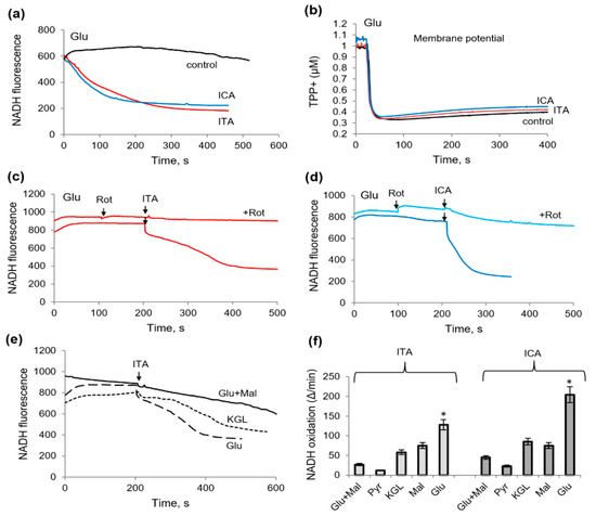 As shown in Figure 3a, in the presence of ITA or ICA and glutamate, the rate of NADH oxidation increased several times. Figure 3b shows that the stimulation of NADH oxidation is not associated with an uncoupling and a drop in the membrane potential, while at the same concentrations, the substances only had a very weak effect on the membrane potential maintained by glutamate oxidation (Figure 3b). However, the activation of NADH oxidation was removed by rotenone, an inhibitor of the first complex of the respiratory chain (Figure 3c,d).