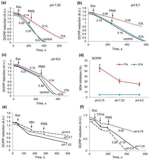 Influence of itaconic and indolcaboxylic acids on the activity of SDH, as measured by DCPIP reduction. DCPIP reduction in the course of succinate (2 mM) oxidation in the presence of ITA (2 mM) and ICA (250 µM) at medium pH equal to 7.25 (a), 6.7 (b), and 8.0 (c), and SDH inhibition (%) at different pH values (d). The influence of the inhibitors of SDH malonate (2 mM) (e) and TTFA (200 µM) (f) on DCPIP reduction and activation by PMS (250 µM) at different pH values of medium; the rates of DCPIP reduction, ΔD/min, are indicated in parentheses.