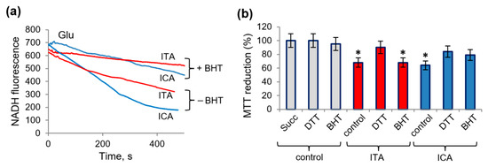 Elimination of the influence of itaconic and indolcaboxylic acids on NADH oxidation and MTT reduction by the antioxidants BHT and DTT. The influence of butyl hydroxytoluene (BHT, 20 µM) on NADH oxidation induced by ITA and ICA in the presence of glutamate as a substrate (a); MTT reduction (%) after the incubation of ITA and ICA with mitochondria in the presence of BHT (20 µM) or DTT (2 mM) and succinate as a substrate (b). Asterisks (*) indicate values that differ significantly from the control values (p < 0.05).