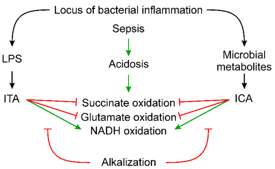 The scheme (Figure 8) summarizes our data on the influence of microbiota-related metabolites, including LPS, on succinate, glutamate and NADH oxidation. LPS provokes the formation of ITA in the tricarboxylic acid cycle of mitochondria of immune cells. ICA is a typical microbial metabolite of tryptophan degradation. Both metabolites inhibit succinate and glutamate oxidation, thus shifting the redox potential of pyridine nucleotides to a more oxidized state. Acidosis enhances these effects, while the thiol antioxidant DTT and the scavenger of lipid radicals BHT partially eliminate them. The alkalization of the medium is the most effective means of protecting mitochondria from these microbiota-related metabolites.