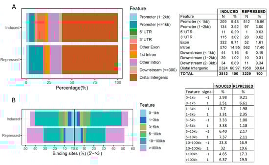 The induced and repressed DCBS were annotated with the annotatePeak function from the ChIPseeker package []. Promoter regions were defined as ±2 kb from the TSS. In addition, the plotDistToTSS function from the ChIPseeker [] was used to plot the distance of the DCBS around the TSS.