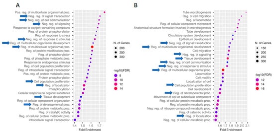 GO enrichment results for the induced (A) and repressed (B) differentially CTCF-binding sites after weaning. The top 30 hits of GO terms are shown in this figure. Biological processes are ranked according to the fold enrichment values. Bubble colors represent the p-value of the False Discovery Rate (FDR). The most significant processes are highlighted in red, and the less significant processes are highlighted in blue according to log10 (FDR) values. Bubble sizes indicate the number of genes. Blue arrows indicate GO terms present in both induced and repressed sites.