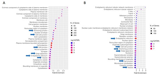 GO enrichment analysis for the induced (A) and repressed (B) differentially CTCF-binding sites after weaning. The top 30 hits of GO terms are shown in this figure. Cellular components are ranked according to the fold enrichment values. Bubble colors represent the p-value of the false discovery rate (FDR). The most significant processes are highlighted in red, and the less significant processes are highlighted in blue according to log10 (FDR) values. Bubble sizes indicate the number of genes. Blue arrows indicate GO terms present in both induced and repressed sites.
