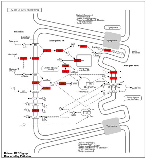 KEGG gastric acid secretion pathway obtained from the induced differentially CTCF-binding sites (DCBS). Genes from the induced DCBS are highlighted in red.