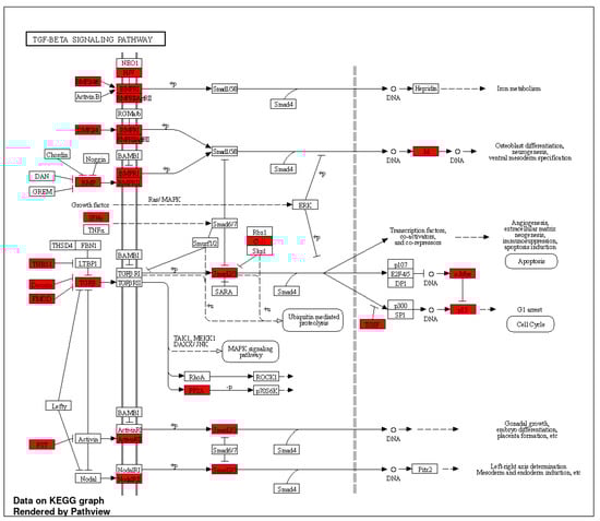 KEGG TGF-β signaling pathway obtained from the repressed differentially CTCF-binding sites (DCBS). Genes from the repressed DCBS are highlighted in red.