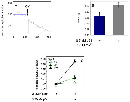 The intrinsic tryptophan residues fluorescence emission of p53 (0.5 μM) was decreased due to increased Ca2+ concentration (Figure 1A). It was observable along with an increased steady-state anisotropy (from 0.066 ± 0.012 to 0.104 ± 0.008) (Figure 1B). The decreasing emission can be interpreted as a structural change to p53 which results in a buried state of tryptophan residues, thus decreasing their fluorescence emission. The increased anisotropy can be described by slower thermal rotational motion of the protein. If tryptophan residues were in turn to be buried in the structure of p53, which, combined with a slower rotational motion of the whole protein, implies a process of structural stabilization with a size increment, this observation could be interpreted as a calcium-induced dimerization of p53. The functional importance of the p53 dimerization could be the initial step for actin binding; thus, we measured the emission of pyrene-labeled actin (2 μM, 5% labeled by pyrene) under polymerizing conditions (100 mM KCl, 1 mM MgCl2) in the presence of p53 (0.05 μM). The fluorescence emission of pyrene shows a 4% and 20% increasein the presence of p53 under micromolar and millimolar calcium (Figure 1C), respectively. It seems that millimolar calcium-induced p53 dimer formation and binding to filamentous actin was more expressed than micromolar calcium.