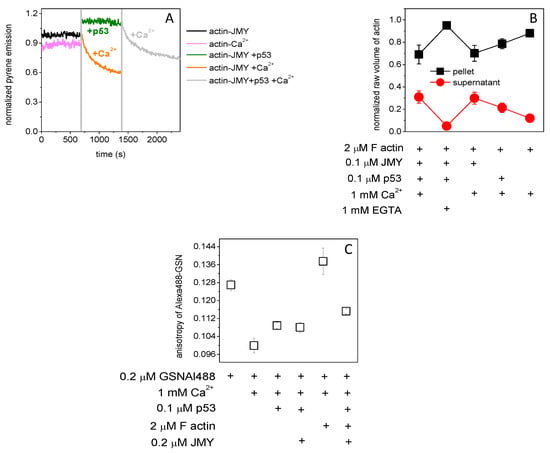 Pyrene–actin (2 μM, 5% labeled by pyrene) was polymerized (100 mM KCl, 1 mM MgCl2) in the presence of 0.5 μM GSN (Figure 3C). The emission of pyrene was a good signal to study the response of the actin–GSN complex to the addition of 0.5 μM JMY in the presence or absence of 0.5 μM p53 under different Ca2+ concentrations. It was the most sensitive in the presence of micromolar Ca2+, where the emission was increased by 12% and then 4% more due to the addition of p53 followed by JMY. In the presence of nanomolar Ca2+, the emission was increased by only 4 % and then 4 % more. In the presence of millimolar Ca2+ and p53, only the JMY addition caused a minor 4% increase of it. However, in the absence of p53, the emission of pyrene–actin was increased by 12% due to the JMY addition under micromolar Ca2+ and by 3 or 6% under nanomolar or millimolar Ca2+, respectively. Although, under nanomolar Ca2+, the inactive GSN [45] (in the absence of PIP2) can possibly bind actin monomer [46,47] with a minor response to p53 and then JMY addition. Under micromolar Ca2+ concentration, the actin filaments are capped by partially active GSN [48,49,50,51] and then can be uncapped by p53 addition. Interestingly, JMY can possibly bind to both uncapped and capped filaments. Under millimolar Ca2+ concentrations, active GSN is continuously severing and capping filaments independently of p53, and then JMY can bind to the pointed ends [41] of short filaments.