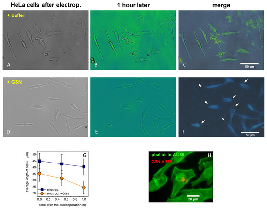 Previous studies published the benefits of low-voltage electroporation [52,53,54,55], as low voltage causes minor stress on cells with a high efficiency of electroporation. We were using current impulses on HeLa cells to increase the GSN concentration in their cytoplasm in order to model the response of stressed cells, as they can increase the expression of stress proteins. The cell size did not show any difference through electroporation with buffer only (Figure 4A–C), but the cell size was reduced by electroporation with 125 nM GSN (Figure 4D–F). The average cell size was significantly decreased by the applied GSN electroporation (Figure 4G). Figure 4H shows that the fluorescent GSN–Alexa568 was localized in the cells, meaning that we successfully applied our low-voltage electroporation system to HeLa cells. A high level of cytoplasmic GSN can be massed next to the cytoplasmic surface of the nuclear envelop in the same localization as in the case of a previous study [11].