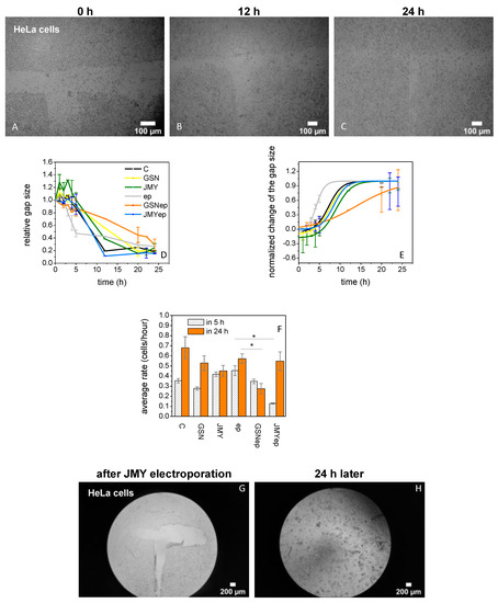 GSN and JMY affect the division and motility of HeLa cells. (A–C) Scratching assays to examine the rate of gap size recovery after GSN or JMY electroporation. In the first 24 h after scratching a ’T’ shape in HeLa cells, the cultures were examined to investigate the effect of GSN or JMY electroporation. (D) The assays provided data about the effect on the change of the relative gap size by simple addition of buffer only (black line), 125 nM GSN (yellow line), 125 nM JMY (green line) to the cell culture or electroporation with buffer only (gray line), with 125 nM GSN (orange line), or with 125 nM JMY (blue line). (E) The normalized change of the gap size gives information about the cellular motility changes in the first 5 h and the division rate at 12 and 24 h. The time-dependent recovery of the scratch is related to the initial size of the gap and the size of the cells. These parameters were used to normalize previous data. The electroporation with GSN shows a different slope of the sigmoid graph. (F) For the analysis of the cellular motility and division rates in cells/hour, we used the normalized values in the first 5 h and 24 h, respectively. The comparison of recovery rates resulted that the electroporation stimulated the cells which were moving faster than non-electroporated cells in the first 5 h. After the electroporation with JMY, the motility of cells was slowed down (* p < 0.05), after they divided faster than electroporated control cells. Due to the electroporation with GSN, cells were moving normally but dividing slowly (p < 0.05). (G,H) HeLa cells recovered the gap fully 20 h after the electroporation with JMY then started to release from the glass slides to the solution. The data presented were derived from at least three independent experiments. Values are displayed as the mean ± standard deviation.