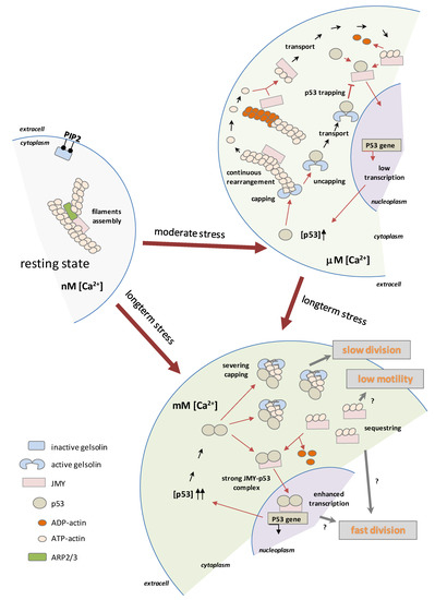Our data suggest that Ca2+ concentration-dependent p53 complexes with GSN or JMY can play an important role in the permanent stress response of cells and possibly help JMY nuclear translocation and increase free p53 concentration in the cytoplasm, regulating the quick rearrangement of filamentous actin and the motility of cells. Moderate stress-caused cytoskeletal remodeling can be coupled to the process of p53 and Ca2+-dependent uncapping of actin filaments, and cytoplasmic accumulation of JMY. However, the cytoplasmic concentration of GSN and JMY may are alternative signals to a mechanism which could be linked to cell cycle control.