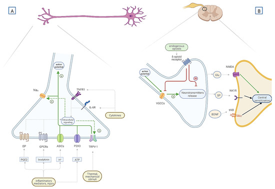One of the most well-known pain-inducing mechanisms is inflammation. There are plenty of described pathways connecting ongoing inflammation and the onset of pain sensation, one of them being the release of the inflammatory mediators and their effect on the signal transmitting properties of nociceptors (see Figure 1) [54].