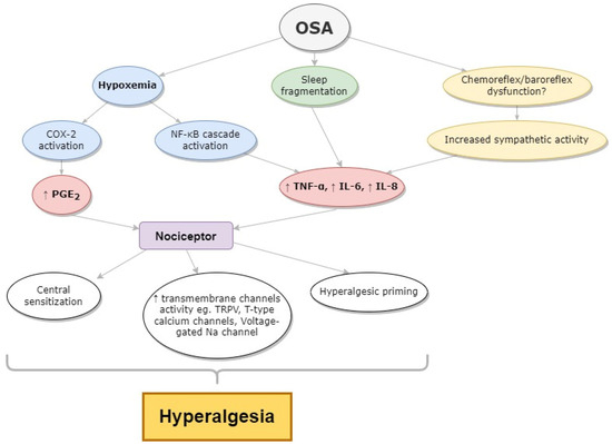 In recent decades, obstructive sleep apnea (OSA) has become a serious societal problem, as it is one of the most prevalent sleep disorders in the world [1]. OSA is a chronic condition caused by the collapse of upper airways during sleep, resulting in nocturnal hypoxemia and sleep fragmentation. The increasing prevalence of OSA is worrying in itself, although the numerous conditions accompanying the disorder have to be taken into consideration while providing the best holistic care for OSA patients. The most common comorbidities can be divided into cardiovascular disorders (e.g., hypertension and ischemic heart disease) and metabolic disorders (e.g., type II diabetes, insulin resistance, or metabolic syndrome) [2,3]. Interaction between pain and process occurring during OSA is a relatively new topic of researchers’ interest. However, currently, there is more and more evidence, both at a clinical as well as a molecular level, that sleep-disordered breathing may be responsible for the aggravation and/or modulation of both chronic and acute pain. The link between pain and sleep-disordered breathing is a widely discussed problem in terms of analgesic therapy for OSA patients [4] and the influence of chronic opioid therapy on the onset of OSA [5], as well as the possible aggravation of chronic and acute pain in patients suffering from OSA. The exact mechanism of this phenomenon has not been yet fully understood, though it is possibly related to two main pathophysiological mechanisms of OSA—nocturnal hypoxemia and sleep fragmentation [6,7,8].
