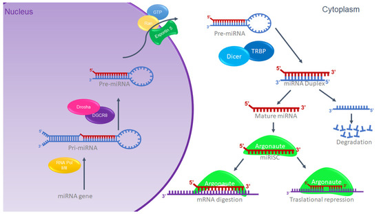 - Kim, Y.-K.; Kim, B.; Kim, V.N. Re-evaluation of the roles of DROSHA, Exportin 5, and DICER in microRNA biogenesis. Proc. Natl. Acad. Sci. USA 2016, 113, E1881–E1889. [Google Scholar] [CrossRef] [PubMed]