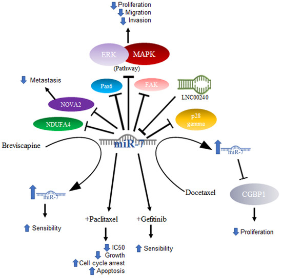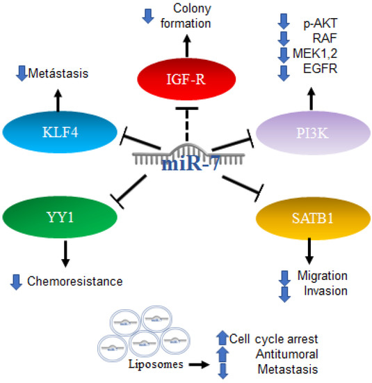 - Gu, D.-N.; Huang, Q.; Tian, L. The molecular mechanisms and therapeutic potential of microRNA-7 in cancer. Expert Opin. Ther. Targets 2014, 19, 415–426. [Google Scholar] [CrossRef]