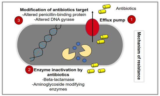 Bacteria acquire resistance toward antibacterial agents (antibiotics) through various mechanisms. (1) Efflux pump activity, in which the intracellular antibiotics are removed from the bacteria cells, which prevents the accumulation of antibiotics at its therapeutic concentrations, intracellularly. (2) Inactivation of enzymes, such as beta-lactamase, and (3) modification of antibiotics targets, such as alterations of the penicillin-binding protein (ABP) and DNA gyrase.