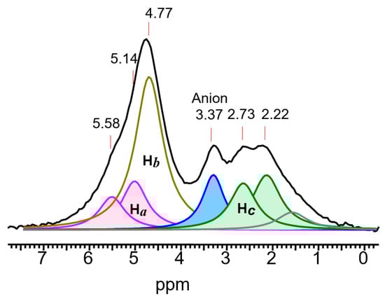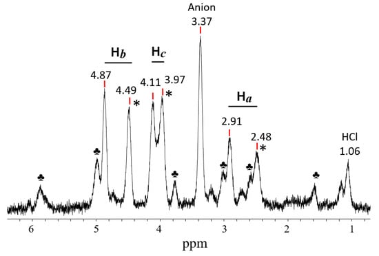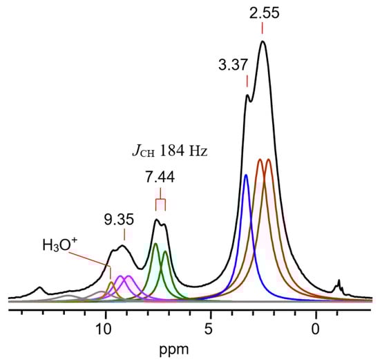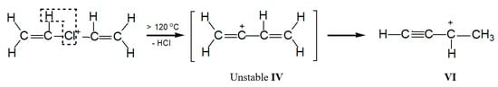. The frequency of the C-Cl stretch vibration is seen at 636 cm−1 (Figure S2 in SI), which is much lower than that of isomers VIII (at 768 cm−1) and IX (at 733 cm−1) [28] and matches the frequency of asymmetric vibration of the bridged C–Cl+–C group of the stablest dimethylchloronium cation, which decomposes at elevated temperature [32]. Therefore, the C-Cl bond is weak, and with an increase in temperature, cation VII can lose the HCl molecule.2.3. Comparative Discussion of the IR and NMR Spectroscopic Data