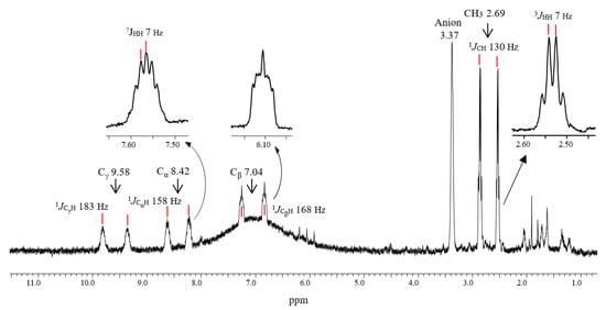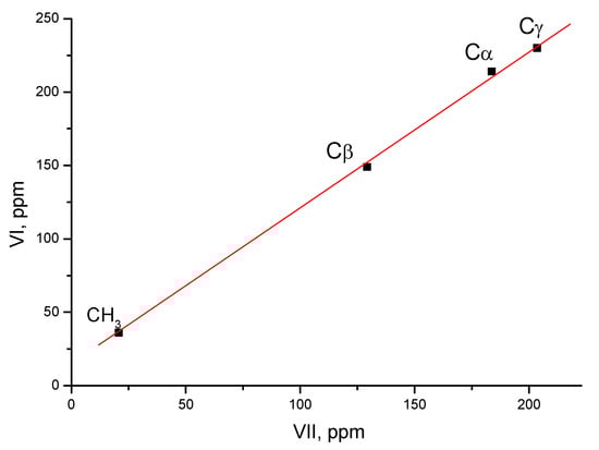 stretch at 1563 cm−1 than that of the double C=C bond in vinyl cations (1490 cm−1) [26,27]. Despite the asymmetry, the positive charge is effectively distributed over both CC bonds: the involvement of the hydrogen atoms of the CH3 group in hyperconjugation with the 2pz orbital of the Cα atom means that it has sp2 hybridization and a major positive charge is concentrated on it. Meanwhile, it follows from the MAS NMR spectra that a comparable charge is also localized on the Cγ atom.Supplementary Materials