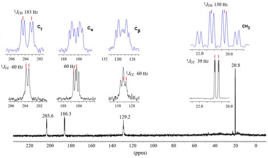 moiety, whose carbon atoms possess the chemical shifts Cγ (203 ppm), Cβ (129 ppm) and Cα (183 ppm). They do not match a triatomic moiety with one CC double bond but rather correspond to slightly asymmetric allyl moiety