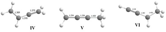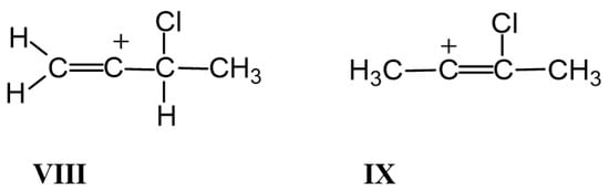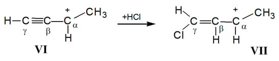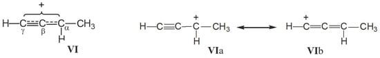 part of vinyl cation VII (Figure 11). This means that electron density distributions—across the CC bonds of the two moieties, which differ in formal double and triple CC bonds—are of the same type, with a lower positive charge on the Cα atom than on atoms Cβ and Cγ. The observed participation of H atoms of the CH3 group in hyperconjugation with the partially empty 2pz orbital of the Cα atom indicates its sp2 hybridization. That is, formally, the Cα atom must carry a considerable positive charge.3. Methods and Materials