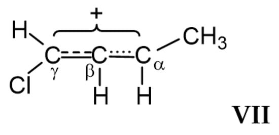 arise, with well-defined and close-to-equivalent C=C double bonds. If the Cl atom is attached to the Cγ atom, then allyl-type isomer VII is formed with considerable alignment of the CC bonds in the