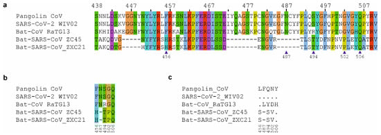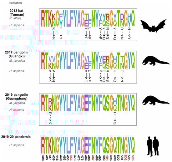 - Zhang, S.; Qiao, S.; Yu, J.; Zeng, J.; Shan, S.; Tian, L.; Lan, J.; Zhang, L.; Wang, X. Bat and pangolin coronavirus spike glycoprotein structures provide insights into SARS-CoV-2 evolution. Nat. Commun. 2021, 12, 1607. [Google Scholar] [CrossRef] [PubMed]