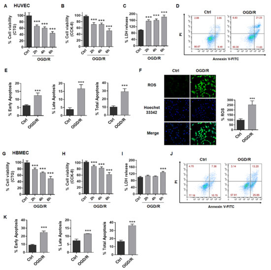 OGD/R induces injury in ECs. (A) Cell viability of HUVECs was tested after OGD for 2 h, 4 h or 6 h and reperfusion for 24 h using CTG assay. (B) Cell viability of HUVECs was tested after OGD for 2 h, 4 h or 6 h and reperfusion for 24 h using CCK-8 assay. (C) LDH release of HUVECs was tested after OGD for 2 h, 4 h or 6 h and reperfusion for 24 h. (D,E) FCM analysis showed apoptosis in HUVECs after OGD4h/R24h. (F) Images and graph showed ROS produced in OGD4h/R24h-treated HUVECs. (G) Cell viability of HBMECs was tested after OGD for 2 h, 4 h or 6 h and reperfusion for 24 h using CTG assay. (H) Cell viability of HBMECs was tested after OGD for 2 h, 4 h or 6 h and reperfusion for 24 h using CCK-8 assay. (I) LDH release of HBMECs was tested after OGD for 2 h, 4 h or 6 h and reperfusion for 24 h. (J,K) FCM analysis showed apoptosis in HBMECs after OGD6h/R24h. OGD/R, oxygen and glucose deprived/reperfusion. LDH, lactate dehydrogenase. HUVECs, human umbilical vein endothelial cells. HBMECs, human brain microvascular endothelial cells. The data are presented as the means ± SD, and were assessed using t test or one-way ANOVA. *** p < 0.001 vs. the Ctrl group. n = 3–4 for all.