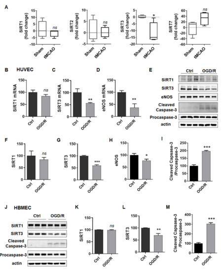 SIRT3 expression is reduced in ECs after exposure to OGD/R. (A) SIRT1, SIRT2, SIRT3 and SIRT7 mRNA levels in the brain cortex of the SD rats following tMCAO or the sham-operated controls from published GSE38037. (B–D) mRNA levels of SIRT1, SIRT3 and eNOS in HUVECs treated with or without OGD4h/R24h. (E–I) Protein levels of SIRT1, SIRT3, eNOS, cleaved caspase-3 and procaspase-3 in HUVECs treated with or without OGD4h/R24h. (J–M) Protein levels of SIRT1, SIRT3, cleaved caspase-3 and procaspase-3 in HBMECs treated with or without OGD6h/R24h. eNOS, endothelial nitric oxide synthase. The data are presented as the means ± SD, and were assessed using t test. * p < 0.05 vs. the Ctrl group or sham group, ** p < 0.01 vs. the Ctrl group, *** p < 0.001 vs. the Ctrl group. ns, no significance. n = 3 for all.