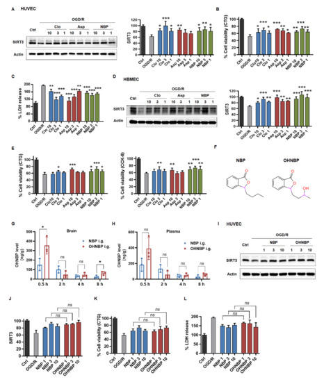 Furthermore, we asked whether these findings could be applied in improving the clinical drugs for ischemic stroke, such as NBP. Based on our findings, we hypothesized that NBP derivatives, which showed better blood-brain barrier crossing capability and retained the enhancing effects on SIRT3, might be considered as promising drug candidates for ischemic stroke. Furthermore, 10-hydroxy-NBP (OHNBP), a major circulating metabolite of NBP, was reported to have a much greater ability to cross the blood-brain barrier than NBP [24,25,26]. Thus, we detected the distribution of OHNBP in plasma following oral administration to rats with 20 mg/kg NBP or OHNBP and showed no statistically significant difference between the two group during 8 h, but in the brain, it was increased about 2-fold at 0.5 h and about 3-fold at 8 h compared to that of the NBP group (Figure 4G,H). Furthermore, we tested whether OHNBP still retained the effects on SIRT3 as NBP. As shown in Figure 4I–J, OHNBP could still upregulate SIRT3 expression dose-dependently in OGD/R-treated HUVECs, similarly to that exhibited by NBP. Furthermore, OHNBP alleviated OGD/R-induced injury including enhanced cell viability and decreased LDH release in HUVECs, similar to NBP with no significant change (Figure 4K,L and Figure S1C). This correlation between SIRT3 upregulation and decreased cell injury regulated by OHNBP was also observed in HBMECs (Figure S1D–F). These results suggested that OHNBP may serve as a better alternative to replace NBP due to its similar protective effects against endothelial injury but better blood-brain barrier crossing capability.