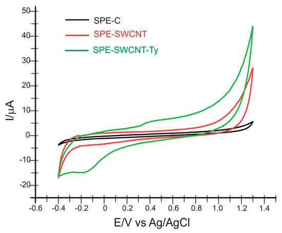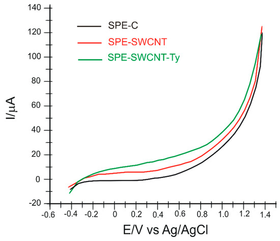 In the first stage of the study, the surface characterization of the electrodes is performed by cyclic voltammetry, not before optimizing the potential range. Both modified electrodes (SPE-SWCNT and SPE-SWCNT-Ty) gave a stable signal in the potential range −0.4 and +1.3 V. Therefore, it was maintained for all determinations in active solutions and real samples.