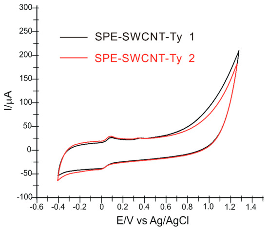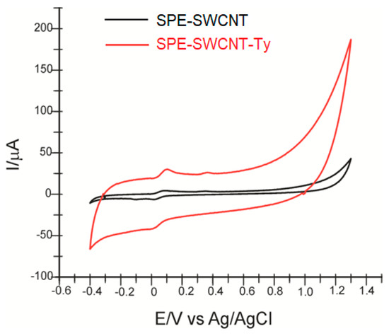 Cyclic voltammograms of SPE-SWCNT (black line) and SPE-SWCNT-Ty (red line) in PBS solution 10−1 M (pH 7.0) containing 10−4 M HT. Scan rate: 0.1 V·s−1.