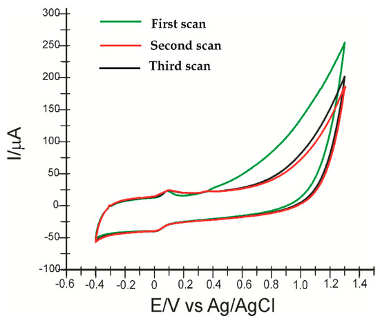 Cyclic voltammogram of SPE-SWCNT-Ty immersed in 10−4 M HT acid solution (electrolyte PBS 10−1 M, pH = 7.0, scan rate 0.1 V·s−1): first scan (green line), second scan (red line) and third scan (black line).