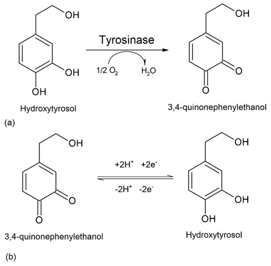(a) Tyrosinase-catalysed oxidation of hydroxytyrosol; (b) reversible electrochemical reduction of hydroxytyrosol at the biosensor surface.