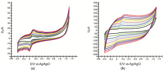 Cyclic voltammograms of SPE-SWCNT (a) and SPE-SWCNT-Ty (b) recorded at different scan rates in the range of 0.1–1.0 V·s−1. The colour correspond to different scan rates.