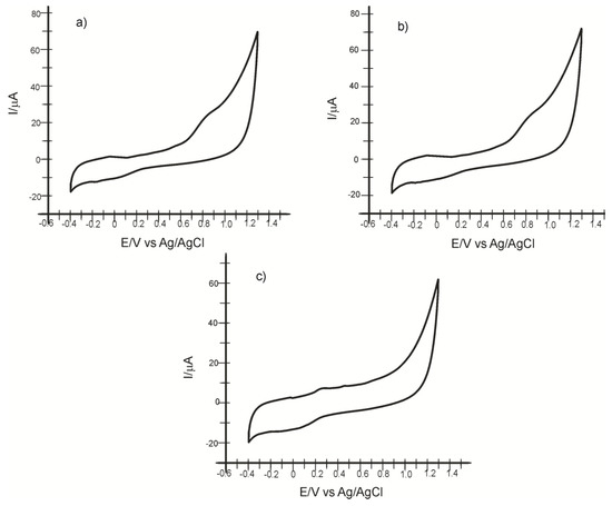 Cyclic voltammograms recorded by the three sensors in 10−1 M PBS solution, pH 7.0, scan rate 0.1 V·s−1.