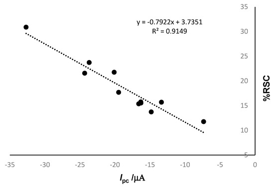 It was determined that there is a linear dependence between cathode peak currents and scanning rate for both electrodes (Table 1). This indicates that the process occurring at the electrode surface is controlled by the adsorption of the electroactive species, with HT adsorption on the active surface being the determining step in the kinetics of the electrochemical process [71].