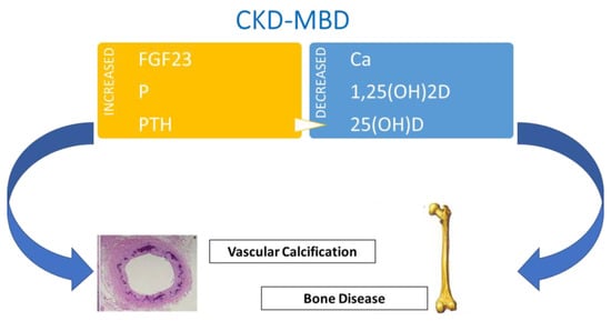 CKD-MBD is a systemic disorder of mineral metabolism, initiated by phosphorus retention and elevated levels of FGF23 and PTH, resulting in a detrimental rebound on skeletal integrity. The disease is characterized by alterations of the principal CKD-MBD biomarkers (calcium, phosphorus, vitamin D, and PTH) associated with anomalies in bone turnover, mineralization, and volume (TMV); extraskeletal calcifications; and atherosclerosis []. In Figure 2, pathogenesis of CKD-MBD is schematized.
