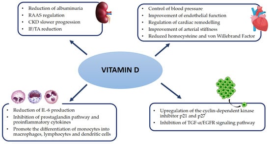 Over the last few years, increasing evidence has been revealed about the impact of vitamin D on cardiovascular health, inflammatory status, cancer, and progression of CKD. The discovery of the VDR enabled multiple investigations on the association of vitamin D deficiency with acute and chronic diseases. Due to the wider distribution of the VDR, vitamin D is associated with several pleiotropic effects: renal-function preservation, regulation of blood pressure, glycemic control, regulation of cellular proliferation, regulation of the renin-angiotensin-aldosterone system (RAAS), and immunomodulation properties [,].
