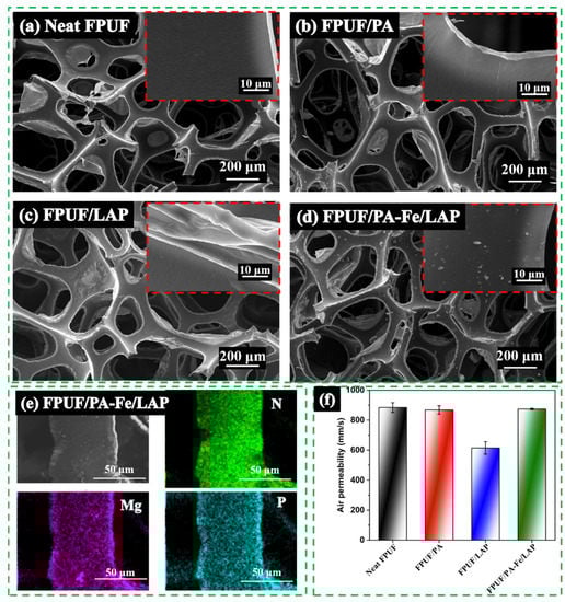 SEM images of neat FPUF (a), FPUF/PA (b), FPUF/LAP (c), and FPUF/PA-Fe/LAP (d), EDX mapping images of FPUF/PA-Fe/LAP (e), and air permeability of FPUFs (f).