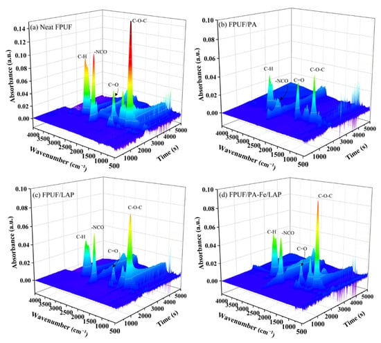 3D FTIR spectra of neat FPUF (a), FPUF/PA (b), FPUF/LAP (c), and FPUF/PA-Fe/LAP (d).