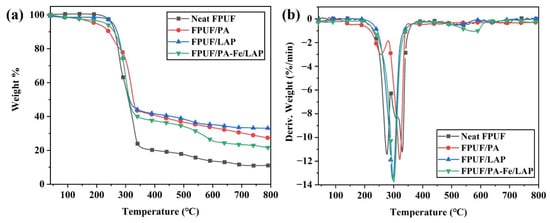 Since the presence or absence of O2 may affect the pyrolysis process of materials, the thermal-oxidative degradation process of neat FPUF and flame-retardant FPUFs is also studied as shown in Figure 5 and Table 2. The changing trend of T5% of flame-retardant FPUFs is consistent with that in N2. It is worth noting that FPUF/LAP and FPUF/PA-Fe/LAP have only one pyrolysis stage, which can be owing to the presence of LAP as an inorganic clay and its better physical barrier function []. It delays the first decomposition stage, resulting in the coexistence of the two degradation stages on the TG curves. Moreover, the amount of char residues increases significantly at 800 °C after flame retardant treatment. The amount of char residues of FPUF/PA, FPUF/LAP, and FPUF/PA-Fe/LAP increases by 144%, 198%, and 102%, respectively, compared with neat FPUF. It indicates that the coatings improve the char formation of FPUF at high temperatures. It is worth noting that FPUF/PA-Fe/LAP has more char residues in air than in N2, probably because iron is present as Fe3O4 during thermal degradation process in N2, which can be further oxidized to Fe2O3 in air [].
