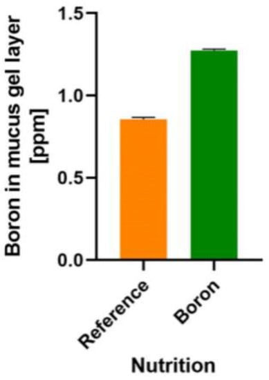 Boron detection in a rat’s colonic mucus gel layer. Reference: normal diet []. Boron: CaFB (NOB) supplemented diet. Boron detection was performed by UHPLC/MS [] (Part S1). CaFB: calcium fructoborate; NOB: naturally organic boron; UHPLC/MS: ultra-high-performance liquid chromatography/mass spectrometry.