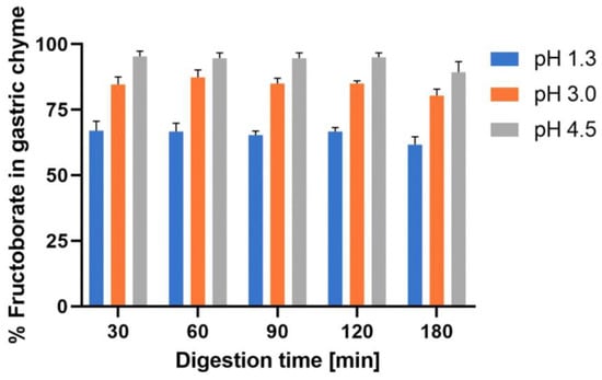 Essentiality should be associated with one specific kind of speciation for the same element. In our view, NOB complexes (e.g., the B-RG-II complex, SBEs, organic polyhydroxy acid borate esters, bis-sucrose borate complexes, amino acid borate esters and, recently, CBDC) may be prebiotic candidates in human/animal nutrition. This is different from BA/borates, which cannot be prebiotic compounds, as these inorganic compounds are digestible and toxic to microorganisms []. In general, in the acidic gastric medium, soluble and insoluble organic B species degrade into B monoesters and diesters [,]. As natural B monoesters and diesters (polyalcohols, organic acids sugars, and CBDC) have a pKa of between 2.5 and 5.0, many of them do not degrade and therefore remain mainly in the organic form of B. At the same time, because BA can be associated with cis-diol organic compounds (fructose, ribose, glucose, and phenolic acids), in the superior part of the digestive tract, the NOB species is probably reconstituted even at pH 4.5 postprandially [].