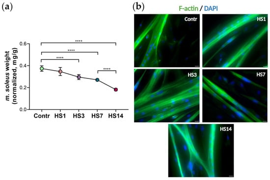 Changes in soleus muscle weight following 1, 3, 7 and 14 days of mechanical unloading (HS): (a) rat soleus muscle weight normalized to the body weight; n = 16, **** p < 0.0001; (b) Myogenic differentiation (the 5th day of differentiation) of myoblasts purified from control muscle and hindlimb suspended muscle (HS1, HS3, HS7, HS14). Myotube formation was visualized with F-actin antibody; scale bar = 20 µm.