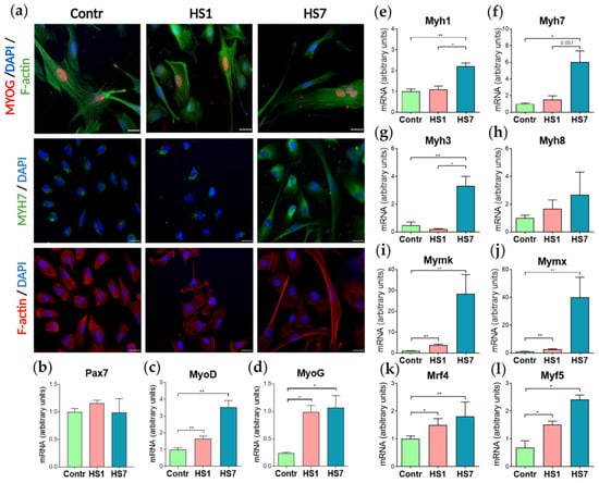 PAX7 is a marker of SCs in skeletal muscle, and we have detected Pax7 expression in all myoblast cultures (Figure 3b and Figure S1), but the fraction of PAX7+ cells differed between the cultures: in the control and HS1 cultures we detected about 90% of PAX7+ cells, while in the HS7 cultures only 70% of myoblasts expressed PAX7 (Figure 2b,d). At the same time, using immunostaining, in all the cultures we detected the expression of myogenic marker MYOD, the expression of which increases when myoblasts are committed to differentiate [] (Figure 2b,d). The calculation of MYOD+ fraction in all the cultures revealed the dynamics opposite to one for PAX7+ cells: in the HS1 cultures we detected a significant decrease in MYOD+ cells, while in the HS7 cultures this fraction significantly increased compared to the control values (Figure 2d). To summarize, the analysis of PAX7+ and MYOD+ cellular subpopulations showed that the PAX7+/MYOD+ composition differs between the Control/HS1/HS7 cultures. While in the HS1 samples the fraction of PAX7+ cells were substantially greater than the fraction of MYOD+ cells; in the HS7 samples the fraction of PAX7+ cells dropped down significantly and the fraction of MYOD+ cells increased up to 90%, indicative of an increase in subpopulation of myoblasts committed to differentiate between day 1 and day 7 of HS (Figure 2d). The immunostaining for another myogenic transcription factor, MYOG, that controls early steps of differentiation including myoblasts fusion [], also confirmed its expression in all the cultures. Both immunostaining and qRT-PCR analysis showed an increased expression of slow-type myosin in the HS7 cultures but not in the control and HS1 samples (Figure 3a).